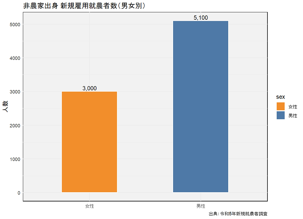 一方で、非農家出身者全体と比較すると、新規学卒就農者の割合は限定的である。男性は5,100人中860人、女性は3,000人中420人であり、いずれも約15%前後にとどまる。