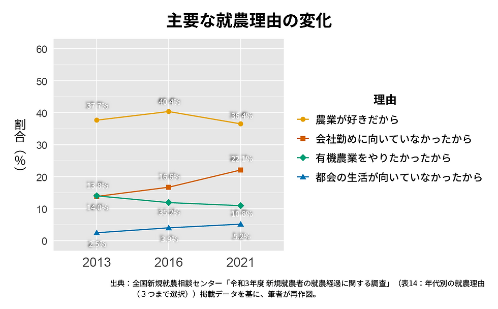 「会社勤めに向いていなかったから」13.8% → 16.6% → 22.1% と、着実に増加。会社員という働き方に違和感を持ち、「別の生き方」を求めて農業に移る人が増えています。